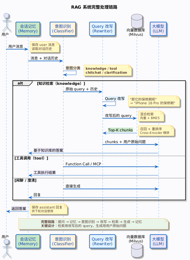 整个系统的核心思路是 RAG(Retrieval-Augmented Generation)架构,也就是先从知识库里检索相关内容,再把检索结果作为上下文交给大模型生成答案。